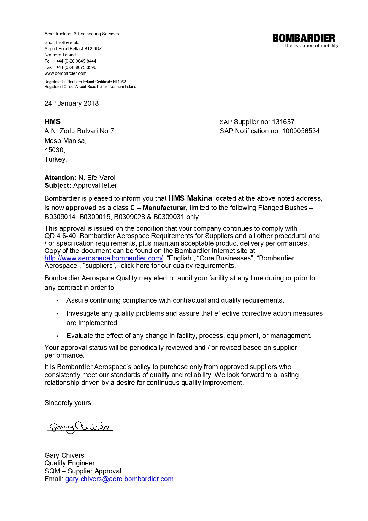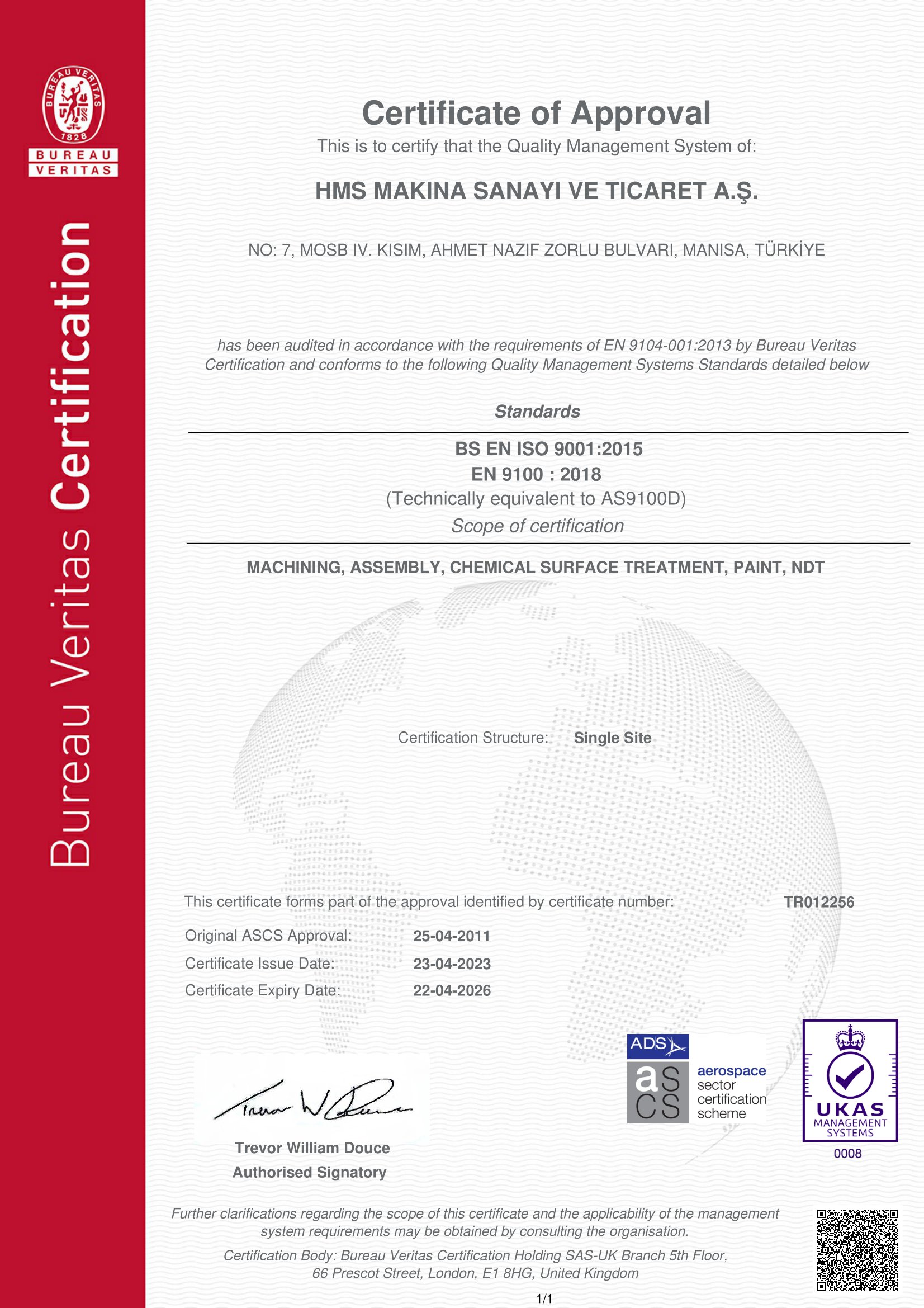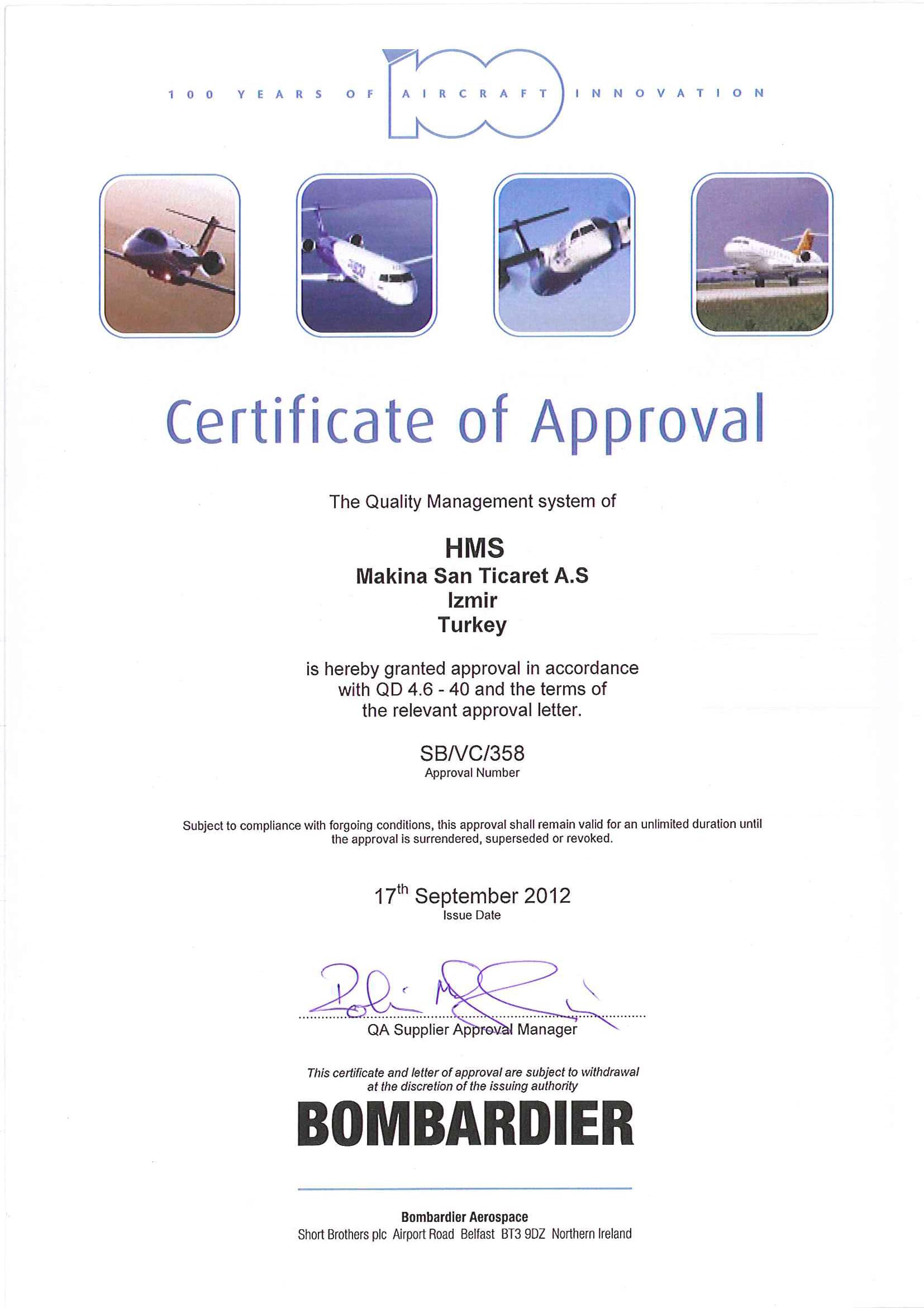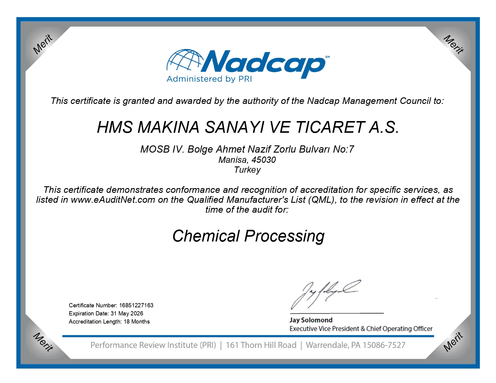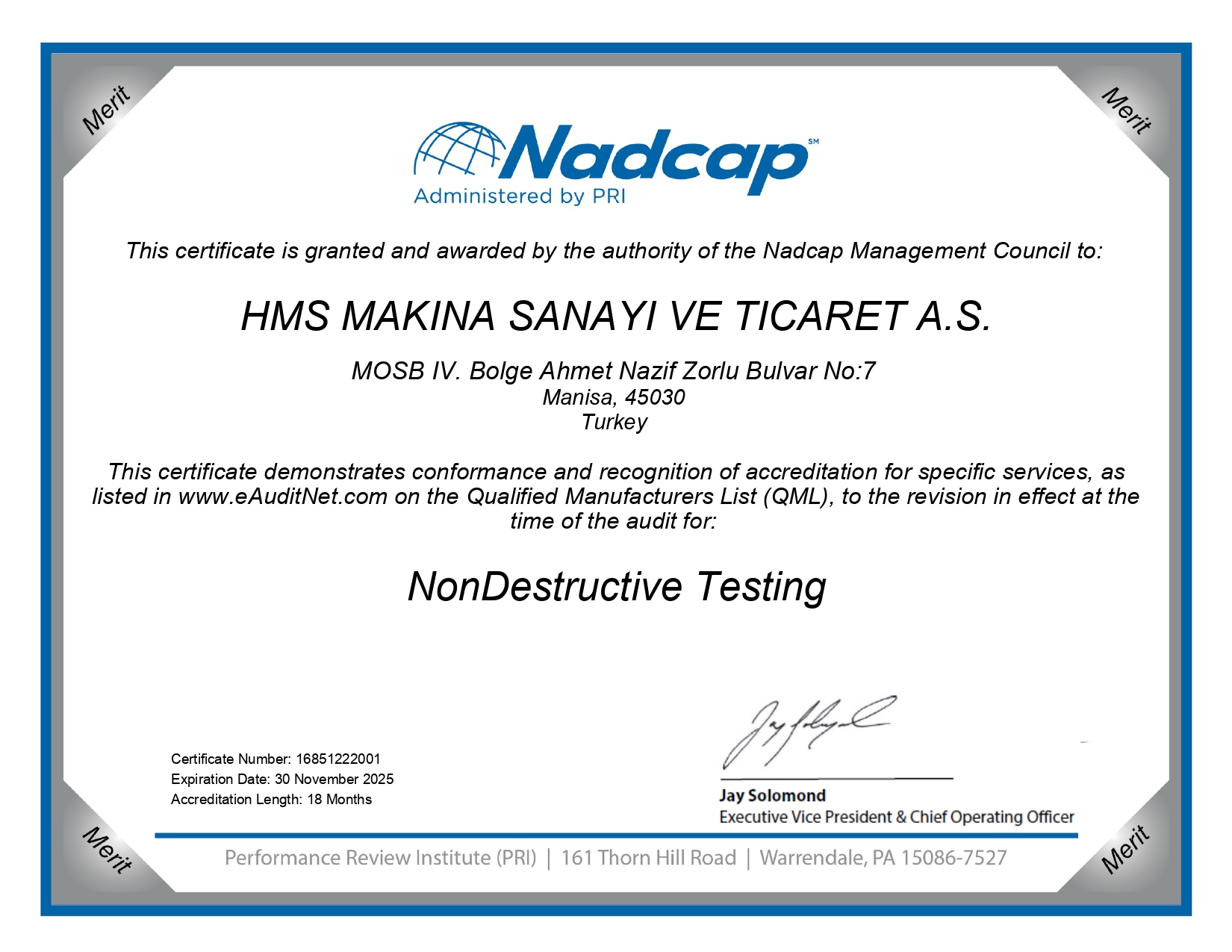Sertifikalar HMS Makina ISO 9001, AS 9100 Kalite Yönetim Sistemleri ve NADCAP sertifikalarına sahiptir SERTİFİKALAR KALİTE NADCAP MÜŞTERİLERİN TEDARİKÇİ SERTİFİKALARI TÜM PROSES ONAYLARIMIZ